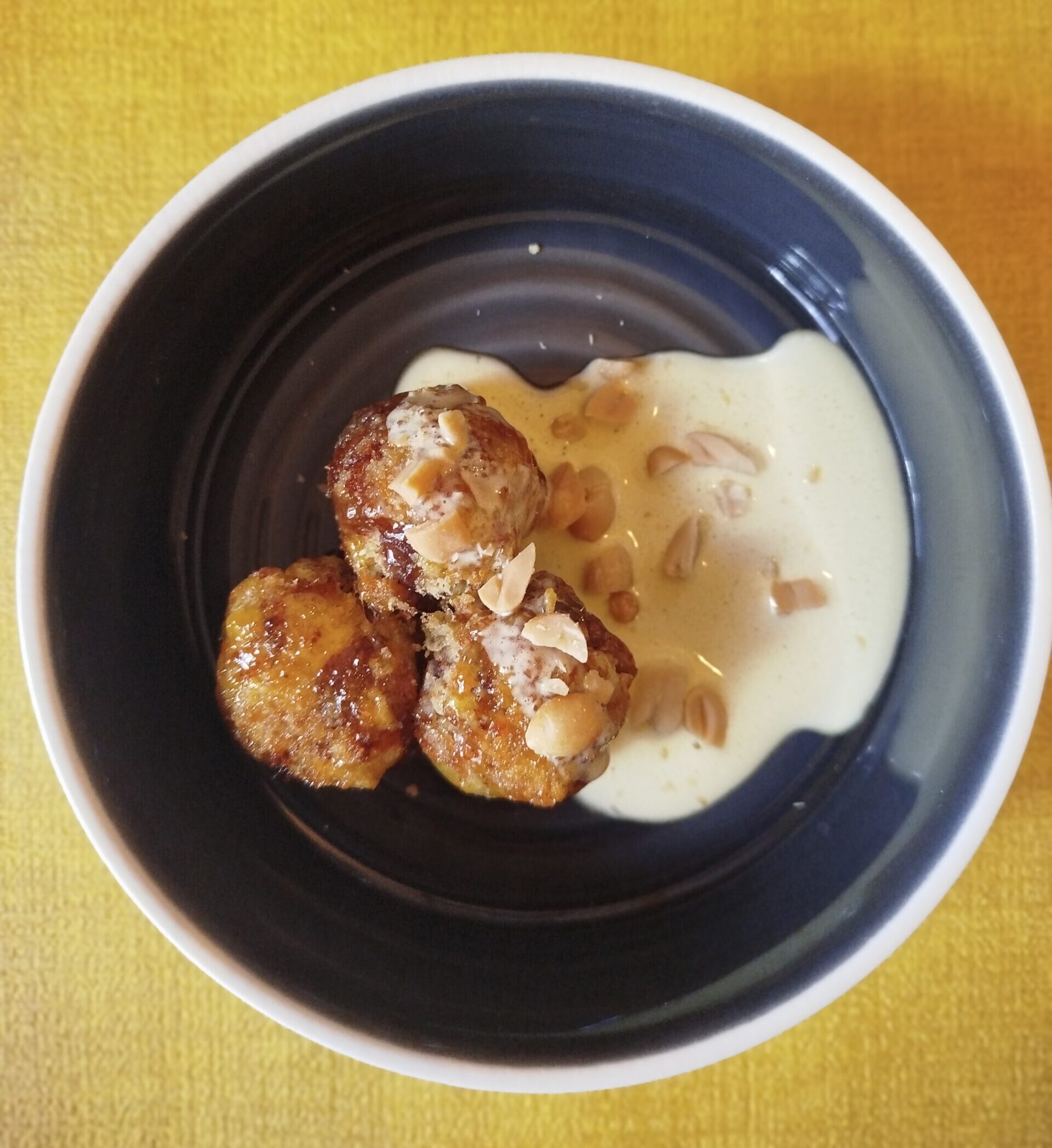 polpette di panettone caramellato, zabaione all’amaro siciliano “Mannamaru”, arachidi tostate